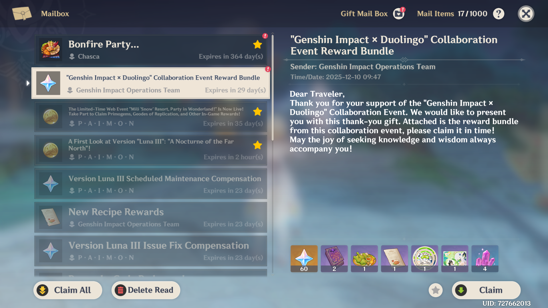 <img loading=“lazy” src=“https://assetsio.gnwcdn.com/genshin-impact-duolingo-reward-mail.png?width=2048&height=2048&fit=bounds&quality=85&format=jpg&auto=webp" onerror=“this.onerror=null;this.src=‘https://blogger.googleusercontent.com/img/a/AVvXsEhe7F7TRXHtjiKvHb5vS7DmnxvpHiDyoYyYvm1nHB3Qp2_w3BnM6A2eq4v7FYxCC9bfZt3a9vIMtAYEKUiaDQbHMg-ViyGmRIj39MLp0bGFfgfYw1Dc9q_H-T0wiTm3l0Uq42dETrN9eC8aGJ9_IORZsxST1AcLR7np1koOfcc7tnHa4S8Mwz_xD9d0=s16000';" alt=“The Genshin Impact player mailbox displaying the “Genshin Impact x Duolingo Collaboration Event Reward Bundle” letter, which reads: “Dear Traveler, Thank you for your support of the “Genshin Impact x Duolingo” Collaboration Event. We would like to present you with this thank-you gift. Attached is the reward bundle from this collaboration event, please claim it in time! May the joy of seeking knowledge and wisdom always accompany you!” - 7”>