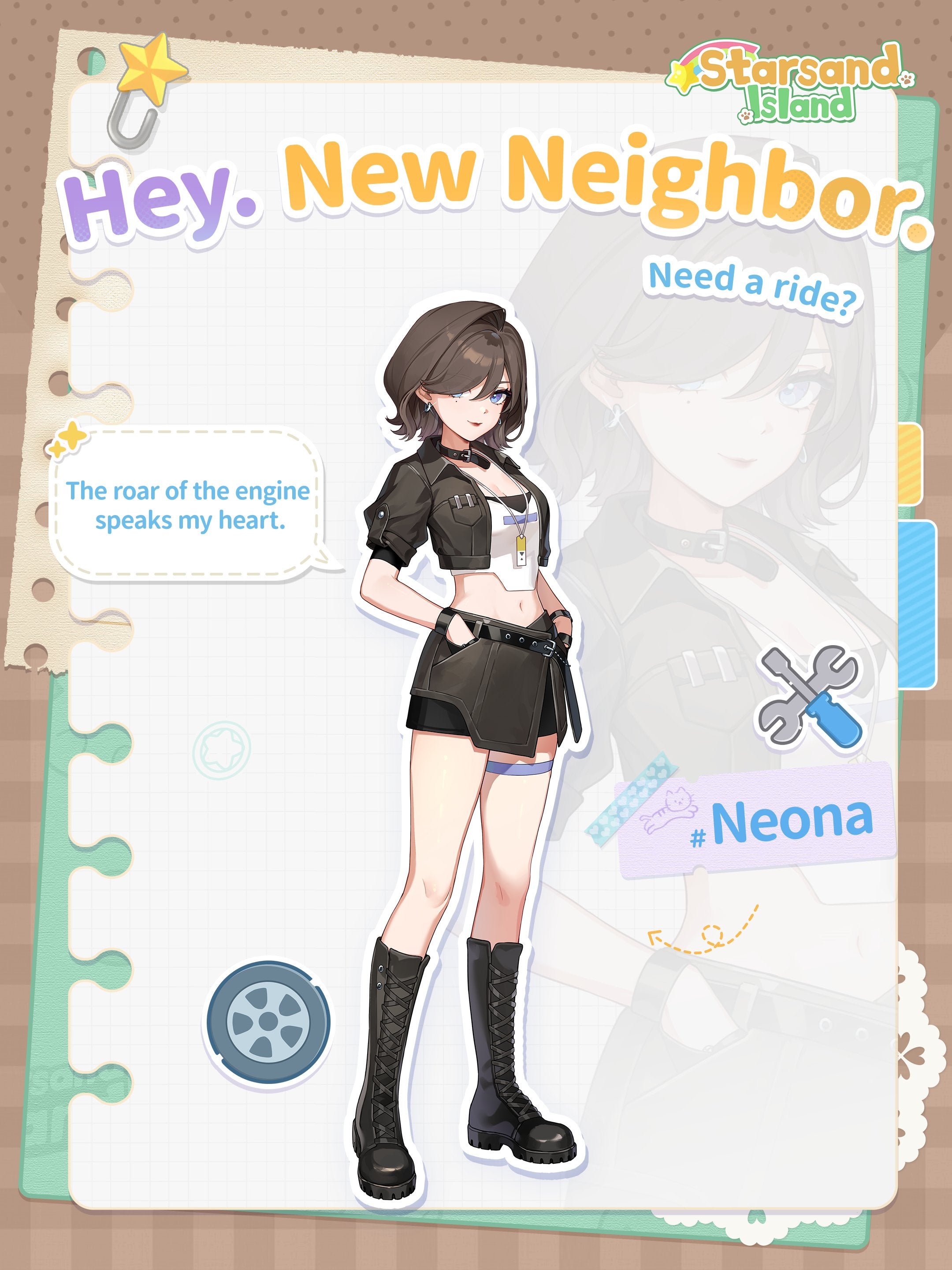 <img loading=“lazy” src=“https://assetsio.gnwcdn.com/starsand-island-neona-card.jpg?width=2048&height=2048&fit=bounds&quality=85&format=jpg&auto=webp" onerror=“this.onerror=null;this.src=‘https://blogger.googleusercontent.com/img/a/AVvXsEhe7F7TRXHtjiKvHb5vS7DmnxvpHiDyoYyYvm1nHB3Qp2_w3BnM6A2eq4v7FYxCC9bfZt3a9vIMtAYEKUiaDQbHMg-ViyGmRIj39MLp0bGFfgfYw1Dc9q_H-T0wiTm3l0Uq42dETrN9eC8aGJ9_IORZsxST1AcLR7np1koOfcc7tnHa4S8Mwz_xD9d0=s16000';" alt=“Starsand Island’s Neona in her October 2025 artwork reveal. Neona has short dark hair and wears noticeable dark makeup over pale skin. She is dressed revealingly in a black miniskirt, short black jacket, white crop top, and black knee-high boots. Her quotes are “Hey. New Neighbor. Need a ride?” and “The roar of my engine speaks my heart.” - 7”>