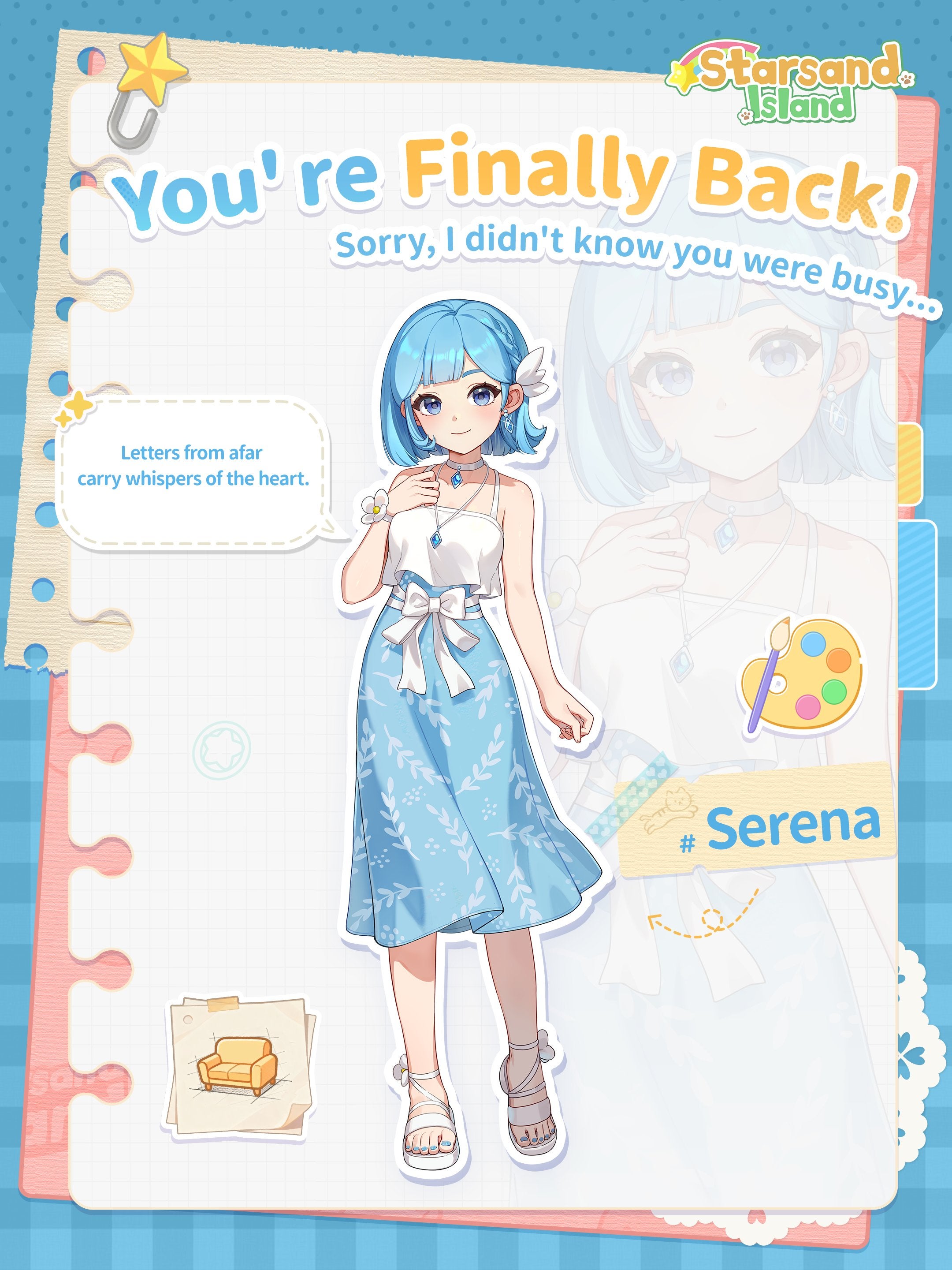 <img loading=“lazy” src=“https://assetsio.gnwcdn.com/starsand-island-serena-card.jpg?width=2048&height=2048&fit=bounds&quality=85&format=jpg&auto=webp" onerror=“this.onerror=null;this.src=‘https://blogger.googleusercontent.com/img/a/AVvXsEhe7F7TRXHtjiKvHb5vS7DmnxvpHiDyoYyYvm1nHB3Qp2_w3BnM6A2eq4v7FYxCC9bfZt3a9vIMtAYEKUiaDQbHMg-ViyGmRIj39MLp0bGFfgfYw1Dc9q_H-T0wiTm3l0Uq42dETrN9eC8aGJ9_IORZsxST1AcLR7np1koOfcc7tnHa4S8Mwz_xD9d0=s16000';" alt=“Starsand Island’s Serena in her October 2025 artwork reveal. Serena is a young woman with short blue hair, wearing a loose white tank top, blue fern-patterned skirt, and white sandals. Her quotes are “You’re Finally Back! Sorry, I didn’t know you were busy…” and “Letters from afar carry whispers of the heart.” - 9”>